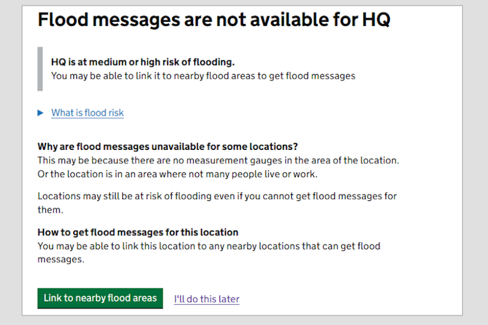 Image 9: Notification showing flood messages are not available for the location. Image courtesy of the Environment.