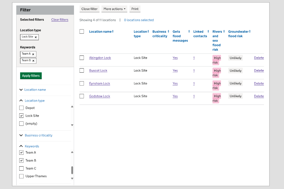 Image 10: Filters on your organisation’s locations page. Image courtesy of the Environment Agency.