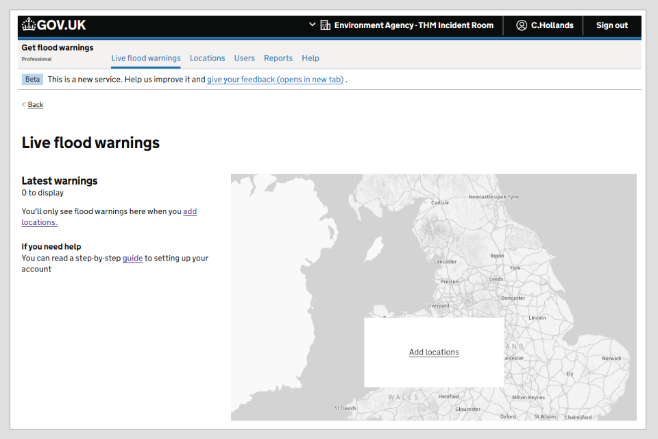 If there are no flood alerts or warnings in force, or no locations associated with the account, the map display will be empty.
