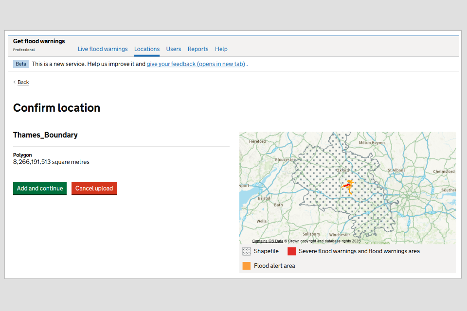 Step 4: Once your file is uploaded a summary map will display all flood alerts and flood warnings that will be included for this location. If the location covers the correct area select ‘Add and continue’. Select ‘Cancel upload’ to return to the upload page.