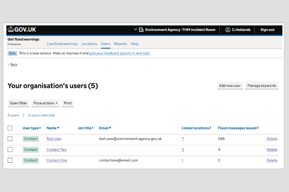 - user type, admin or contact - admin users can edit the locations and contacts for your organisation’s account and they can also receive flood alerts and warnings, contact users will only receive flood alerts and flood warnings