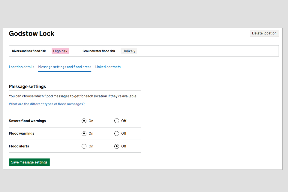 Not all locations will be able to receive all message types. Some locations will only be able to receive flood alerts. In some locations flood messages will be unavailable. It may be possible to link these locations to any nearby flood areas that can get flood messages. For more information see the separate guide on locations.