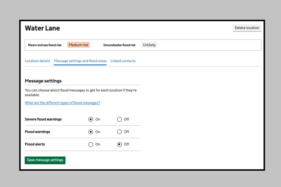 Image 3: Message settings and flood areas tab for locations. Image courtesy of the Environment Agency.