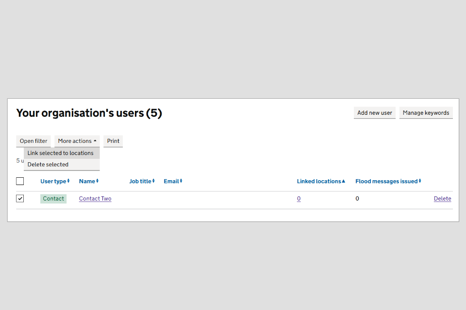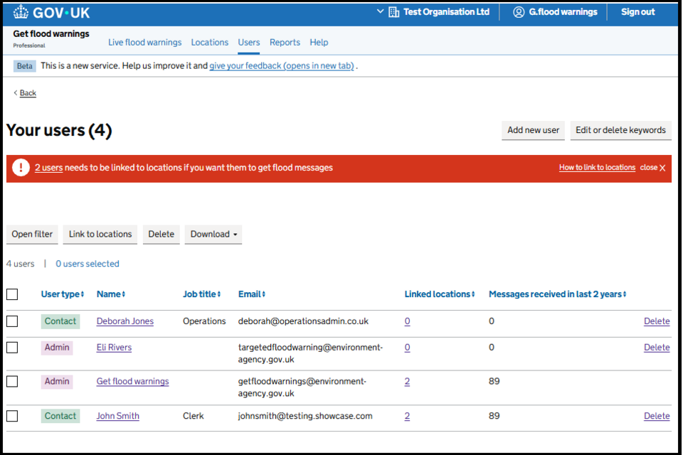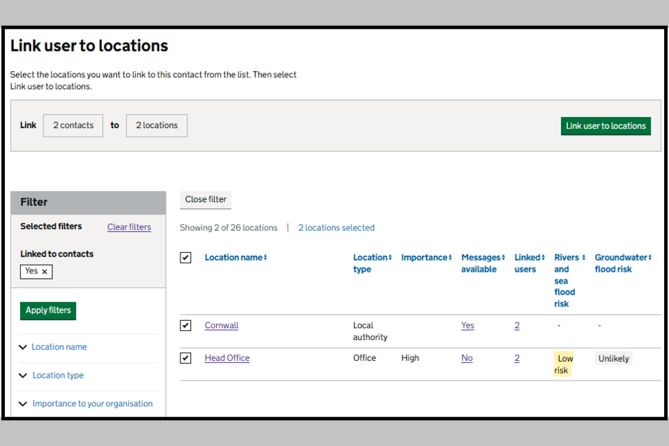 Administrators for an organisation can add locations of interest and then link contacts to these. This allows organisations to tailor which flood alerts and flood warnings each of their contacts receive.