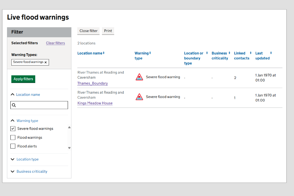 Image 1: Report for live flood warnings showing filter options and print button. Image courtesy of the Environment Agency.