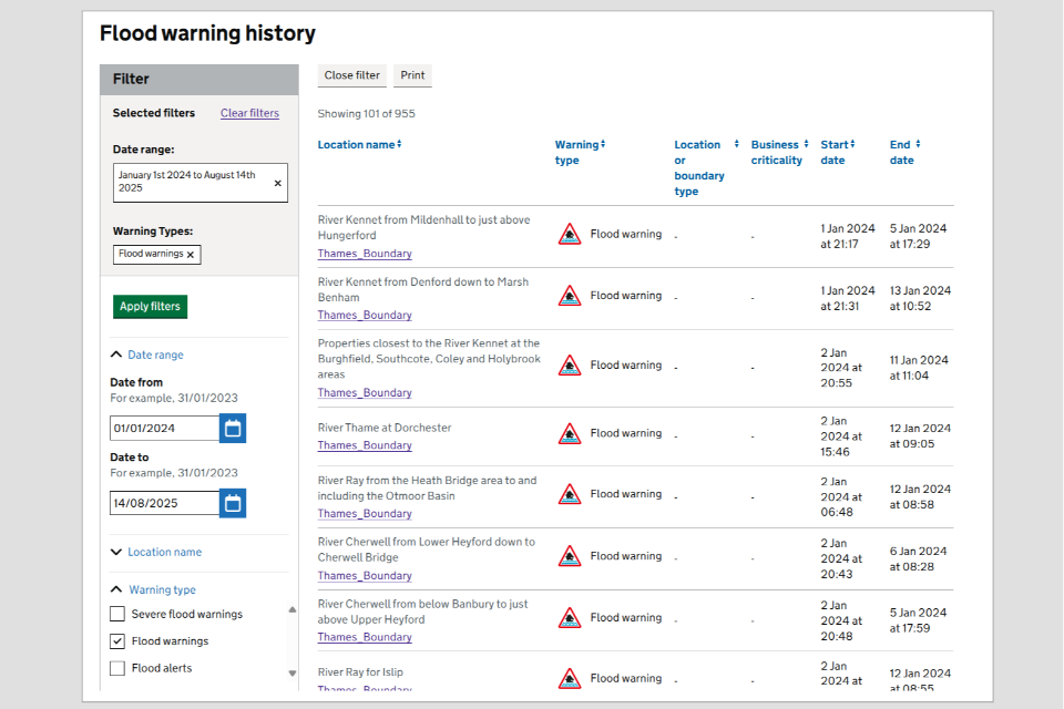 Image 2: Report for flood warning history showing filter options and print button. Image courtesy of the Environment Agency.