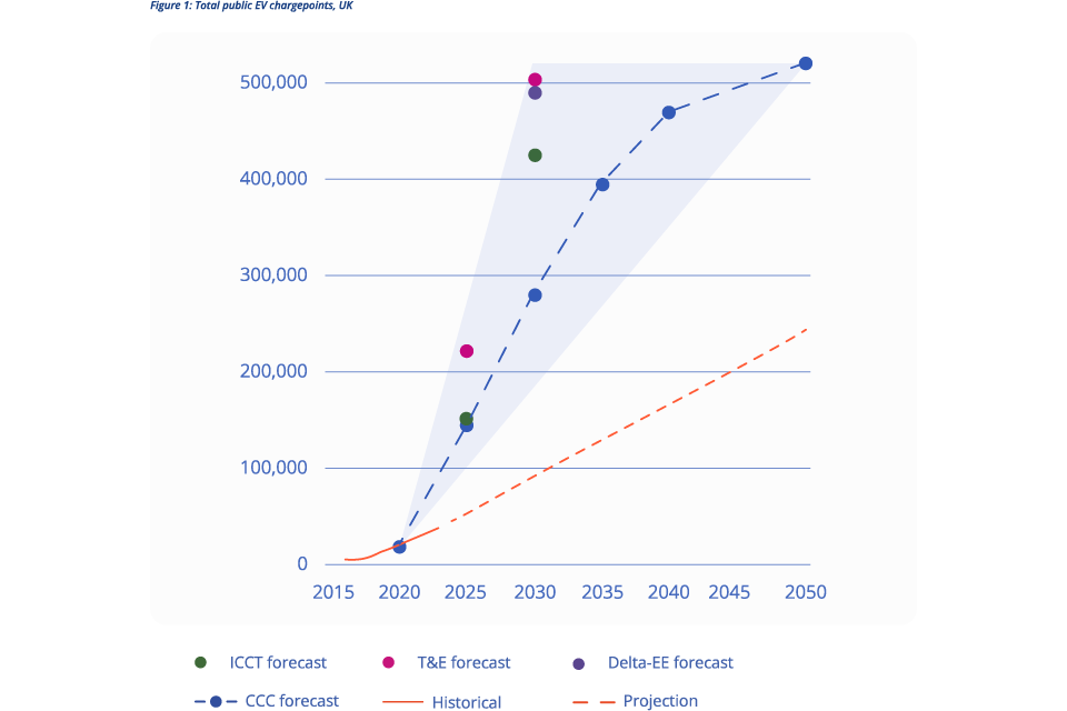 The graph highlights how there is a high degree of uncertainty surrounding the predicted number of public chargepoints required in future through displaying 4 different projections with each forecast based on different assumptions.