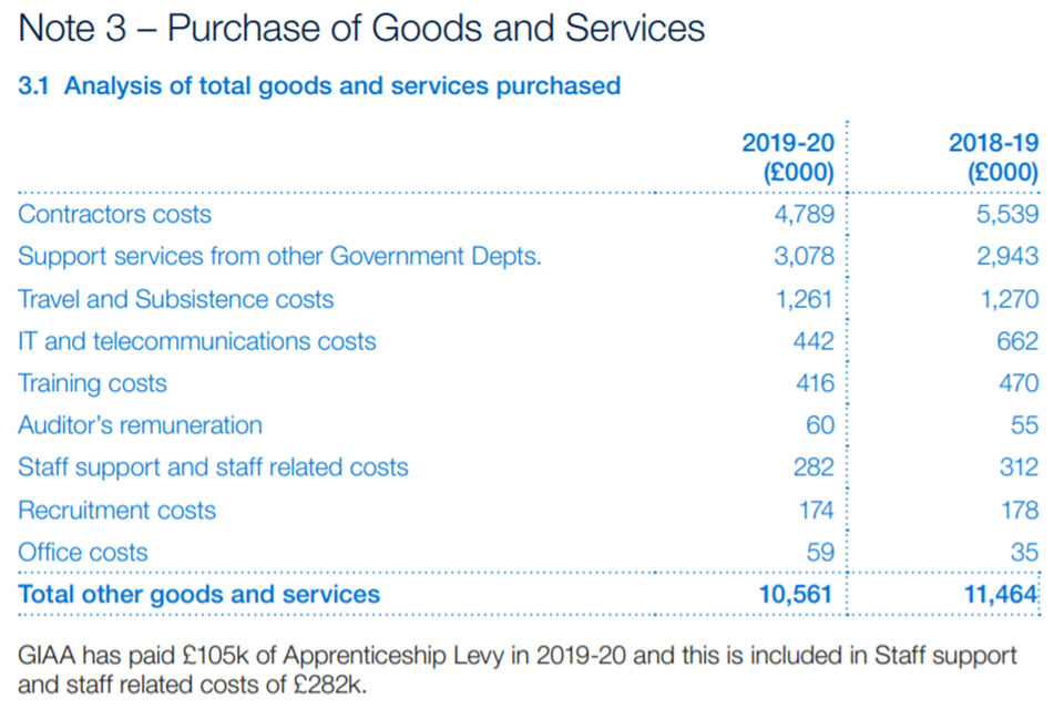 GIAA has paid £105k of Apprenticeship Levy in 2019-20 and this is included in Staff support and staff related costs of £282k.