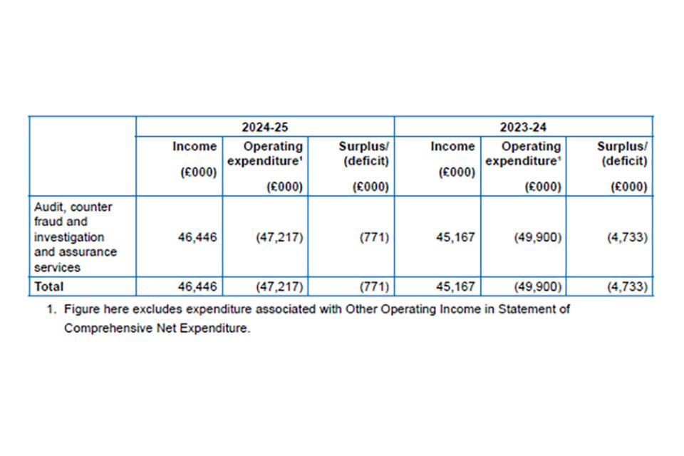 Income for the period of £46,685k relates entirely to audit, counter fraud and investigation and assurance services fee income with the exception of £235k for Grants and £4k other income (2023-24: £45,167 attributable to audit, counter fraud and investigation and assurance services income, £27k for Grants and £7k other income). Of the £46,446k fee income £1,299k of the total income relates to 2023/24 contracts where the contract wasn’t completed at 31 March 2024.