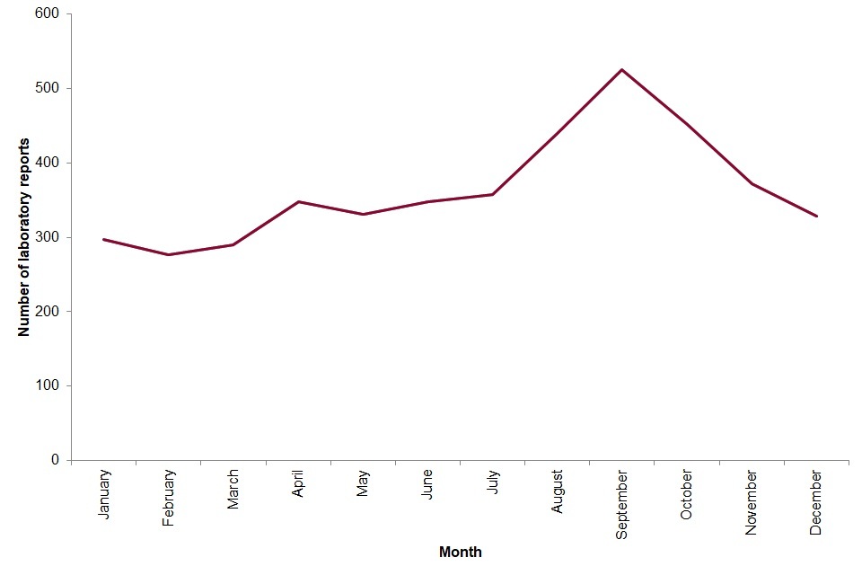 Figure 3: seasonality of laboratory reports of Giardia reported in England 2016[footnote 4].