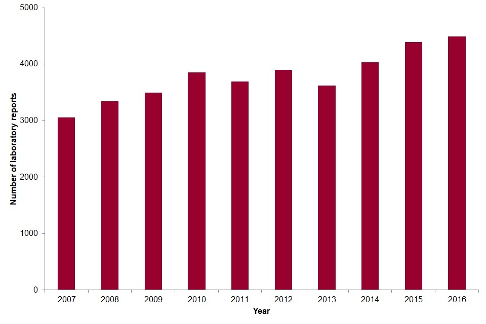 | Year | Number of laboratory reports | per 100,000 population |