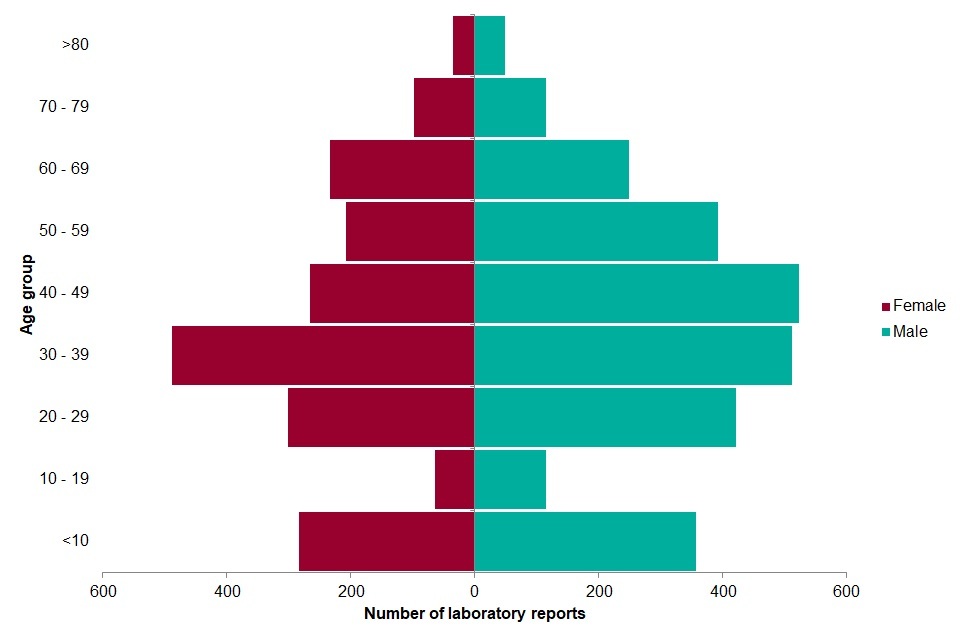Figure 2: age and sex distribution of laboratory reports of Giardia reported in England 2016[footnote 3].