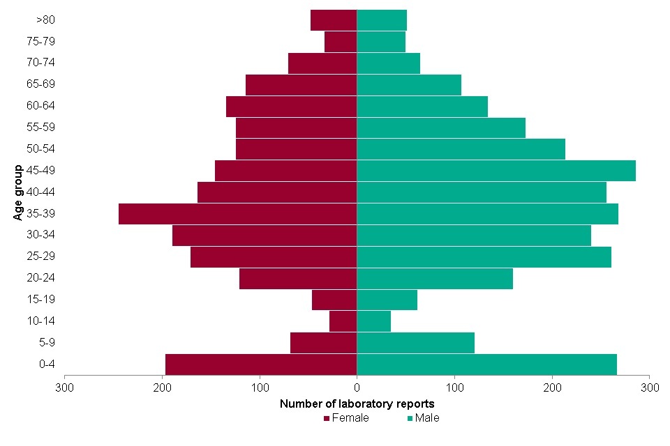 For laboratory reports where age and sex data were available. There were 11 laboratory reports with unknown data recorded. ↩