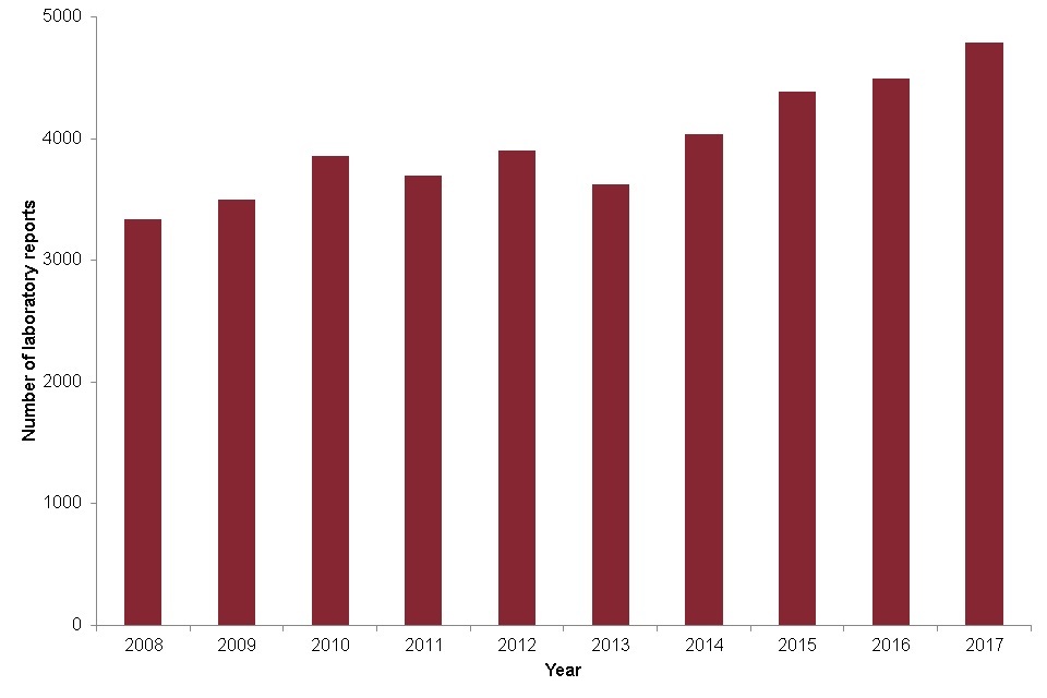 Figure 1: annual laboratory reports of Giardia in England and Wales (2008 to 2017)