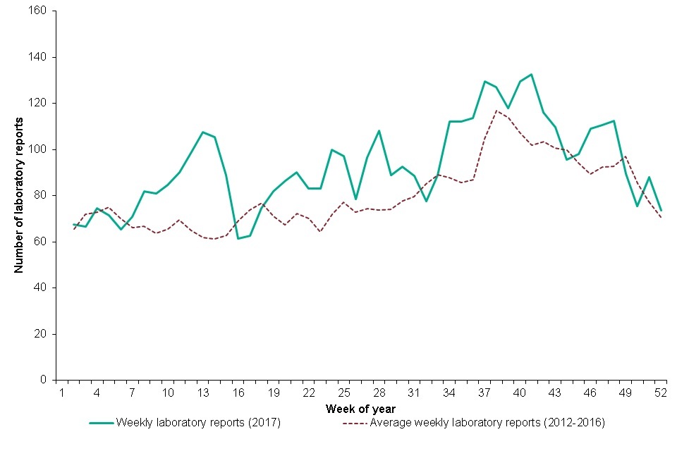 Figure 3: Number of laboratory reports of Giardia in England and Wales by week in 2017, and average number of reports by week in 2012 to 2016.