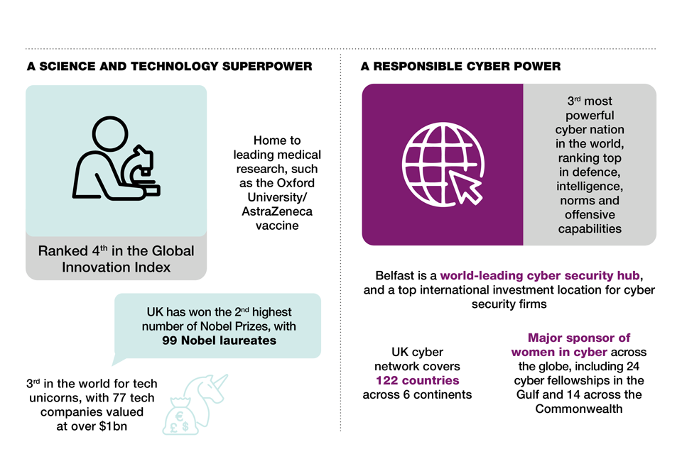 Keeping the UK’s place at the leading edge of science and technology will be essential to our prosperity and competitiveness in the digital age. Our aim is to have secured our status as a Science and Tech Superpower by 2030, by redoubling our commitment to research and development, bolstering our global network of innovation partnerships, and improving our national skills - including by attracting the world’s best and brightest to the UK through our new Global Talent Visa. We will lay the foundations for long-term prosperity, establishing the UK as a global services, digital and data hub by drawing on our nation’s great strengths in digital technologies, and attracting inward investment.