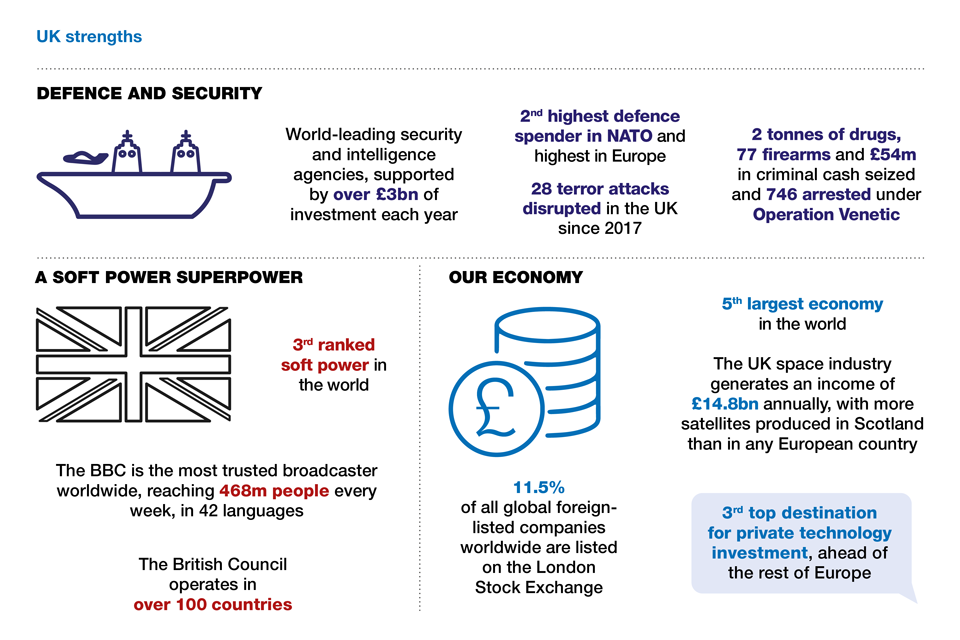 - Defence and security: World-leading security and intelligence agencies, supported by over; £3bn of investment each year; 2nd highest defence spender in NATO and highest in Europe; 28 terror attacks disrupted in the UK since 2017; 2 tonnes of drugs, 77 firearms and £54m in criminal cash seized and 746 arrested under Operation Venetic.
