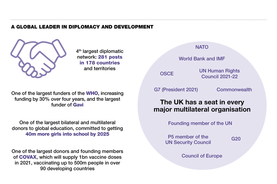 - A global leader in diplomacy and development: 4th largest diplomatic network: 281 posts in 178 countries and territories; One of the largest funders of the WHO, increasing funding by 30% over four years, and the largest funder of Gavi; One of the largest bilateral and multilateral donors to global education, committed to getting 40m more girls into school by 2025; One of the largest donors and funding members of COVAX, which will supply 1bn vaccine doses in 2021, vaccinating up to 500m people in over 90 developing countries; The UK has a seat in every major multilateral organisation: NATO, World Bank and IMF, OSCE, UN Human Rights Council in 2021-22, G7 (President 2021), Commonwealth, Founding member of the UN, P5 member of the UN Security Council, G20, Council of Europe