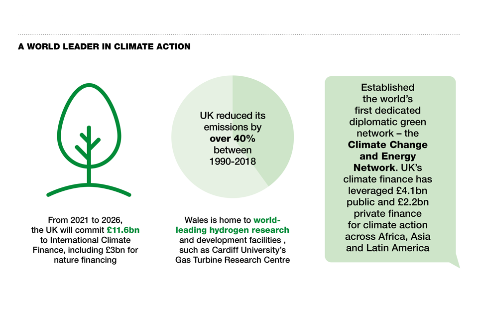 - A world leader in climate action: From 2021 to 2026, the UK will committee £11.6bn to International Climate Finance, including £3bn for nature financing; UK reduced its emissions by over 40% between 1990-2018; Wales is home to world-leading hydrogen research and development facilities, such as Cardiff University’s Gas Turbine Research Centre; Established the world’s first dedicated diplomatic green network - the Climate Change and Energy Network. UK’s climate finance has leveraged £4.1bn public and £2.2bn private finance for climate action across Africa, Asia and Latin America