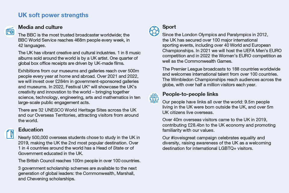 - A soft power superpower: 3rd ranked soft power in the world; The BBC is the most trusted broadcaster worldwide, reaching 468m people every week, in 42 languages; The British Council operates in over 100 countries