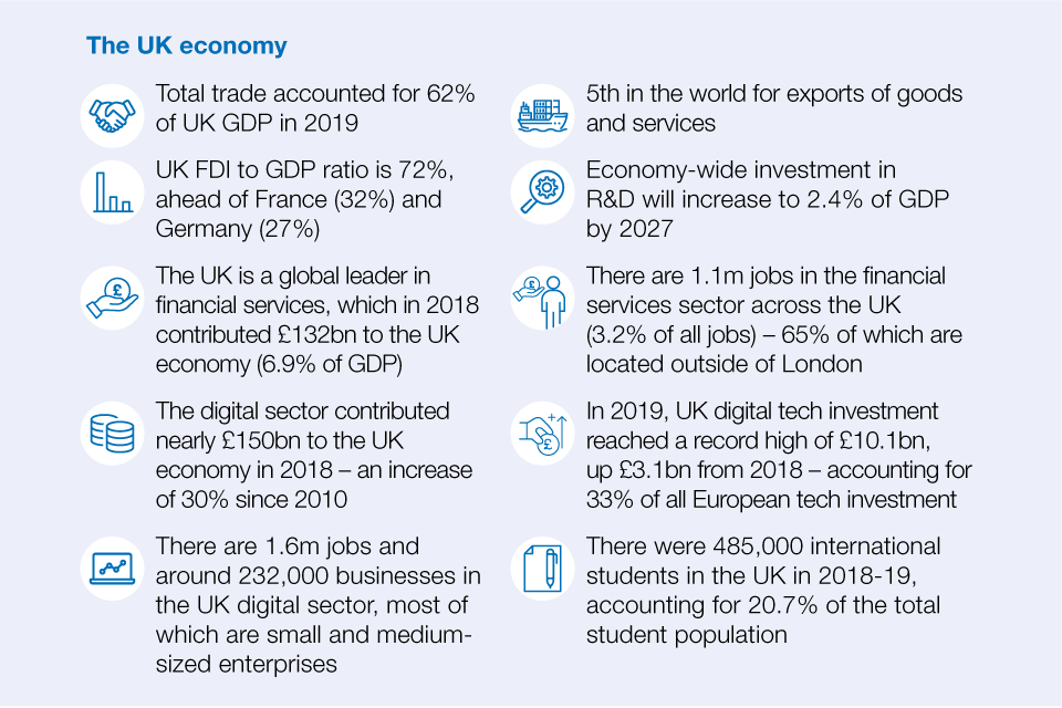 - Our economy: 11.5% of all global foreign-listed companies worldwide are listed on the London Stock Exchange; 5th largest economy in the world; The UK space industry generates an income of £14.8bn annually, with more satellites produced in Scotland than any European country; 3rd top destination for private technology investment, ahead of the rest of Europe