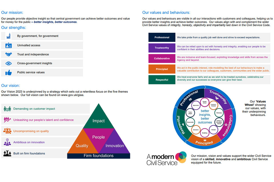 The following page shows the strategic framework within which we operate, including our mission of ‘Better Insights – Better Outcomes’. To help to achieve this, in 2019 we set out an ambitious Vision 2023 for the Agency, with a view to making a step-change in the value we add for our customers, in the respect that we command, and in the engagement of our people. This was underpinned by a strategy focussing on the five themes of Impact, Quality, People, Innovation and Firm Foundations.