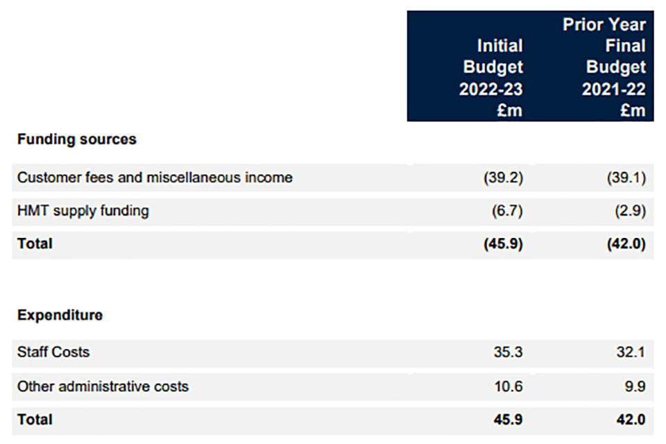 Our budget envelope is set by our Sponsor Department, HM Treasury. Our initial budget for 2022-23 is set out below but will be further updated once our 2022-23 plans for delivery, and associated income, have been finalised in discussion with our customers.