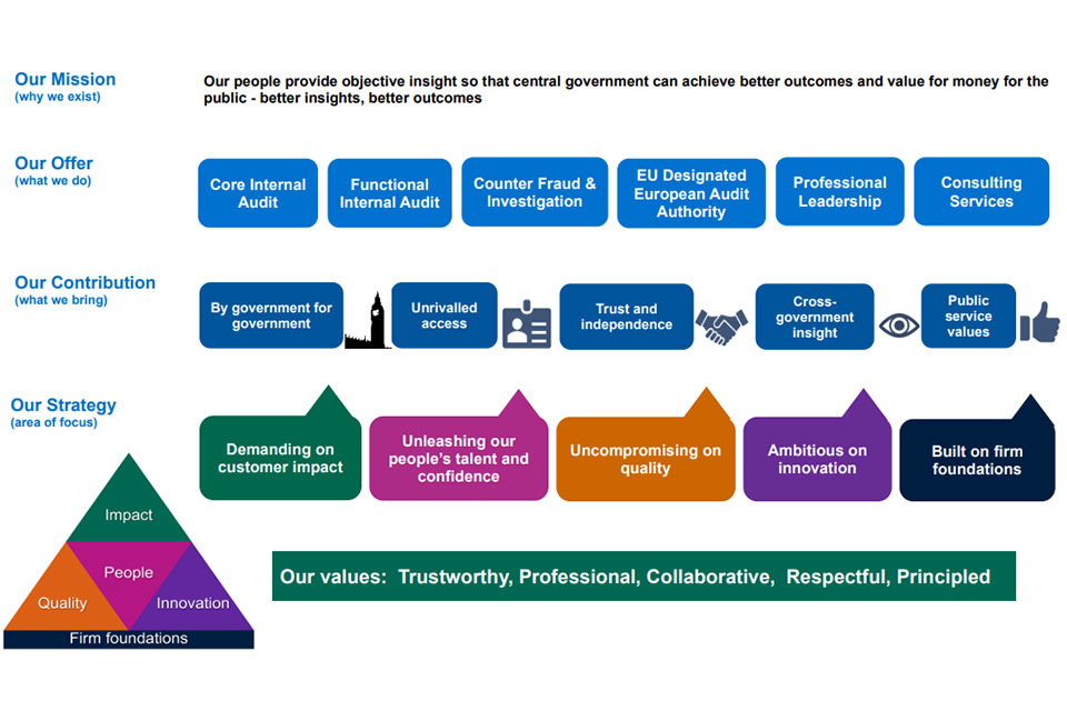Our business model is unapologetically customer focused. We appoint a qualified Senior Civil Servant to the position of Group Chief Internal Auditor (GCIA) for each Department to which we provide our services. This senior leader provides direct support, both to Accounting Officers and the Audit, Risk and Assurance Committees of our customer departments and their Arm’s Length Bodies, as well as overseeing the full range of services provided by their expert teams.
