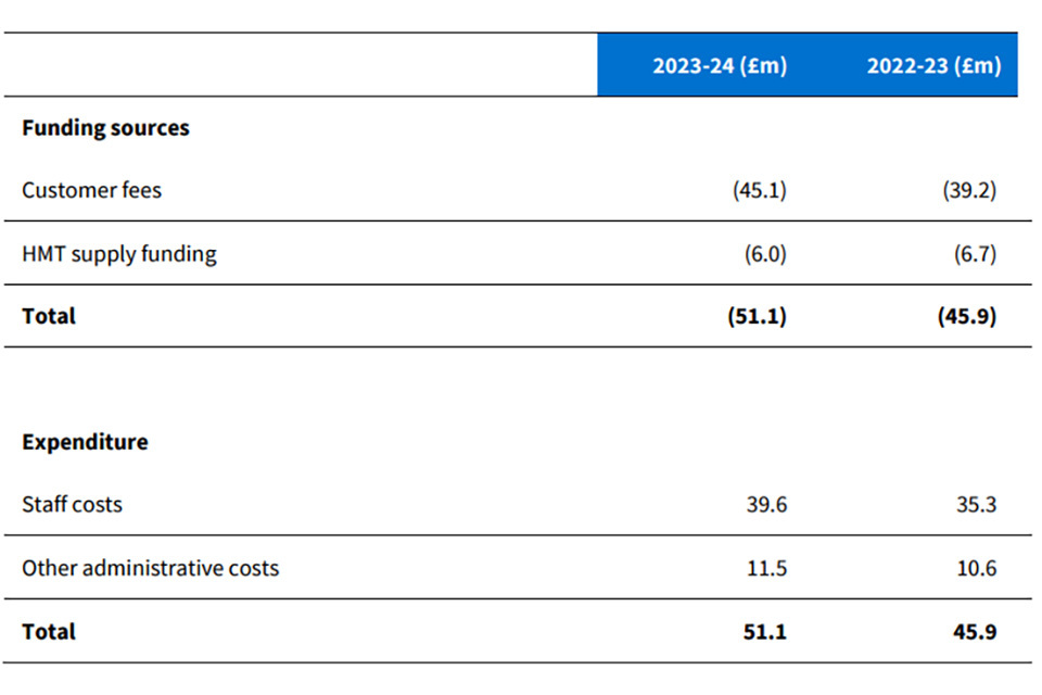 HM Treasury supply funding has reduced from 2022-23 to 2023-24, reflecting the reducing core supply funding as the Agency moves to a full fee funded position by 2024-25.