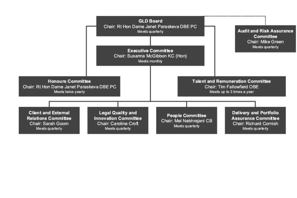 We are led by the Treasury Solicitor and Permanent Secretary, Susanna McGibbon KC (Hon), and are sponsored by the Attorney General’s Office (AGO). The Attorney General is the government’s chief legal adviser and has a number of independent public interest functions, as well as overseeing the Law Officers’ departments. The Law Officers are accountable to Parliament for the performance of GLD. GLD's governance structure is set out in the Governance Statement on page 33.