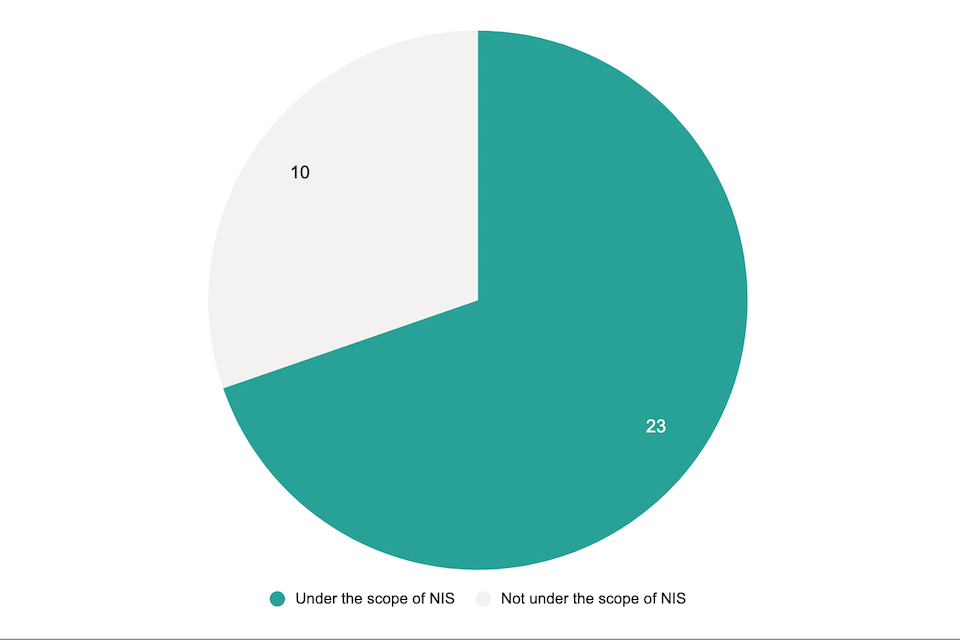 This pie chart shows 23 organisations were under the scope of NIS; and 10 were not under the scope of NIS.