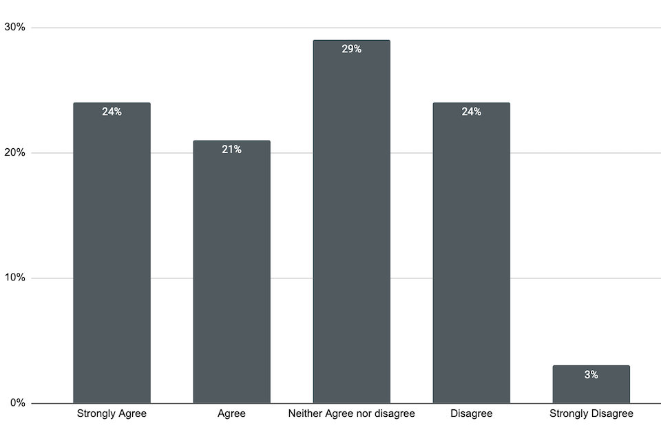 24% of respondents strongly agreed with the Government’s proposals; 21% of respondents agreed; 29% of respondents neither agreed nor disagreed; 24% of respondents disagreed, and 3% strongly disagreed.