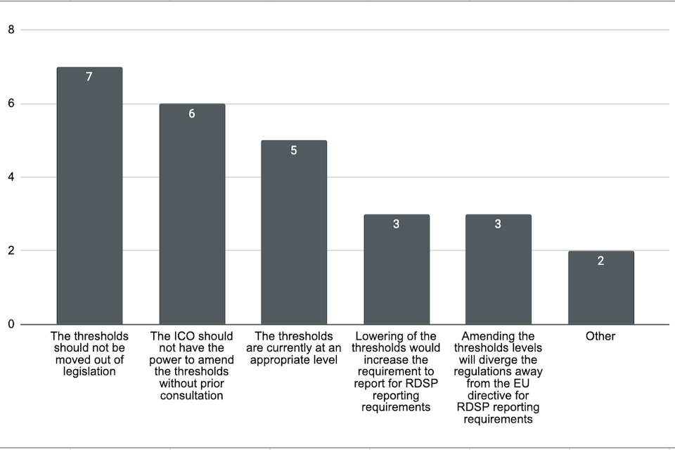 7 respondents said thresholds shouldn’t be moved out of law; 6 said ICO should not be able to change thresholds; 5 said current thresholds are correct; 3 cited increased reporting requirements; 3 said it would diverge from EU rules; 2 cited other reasons