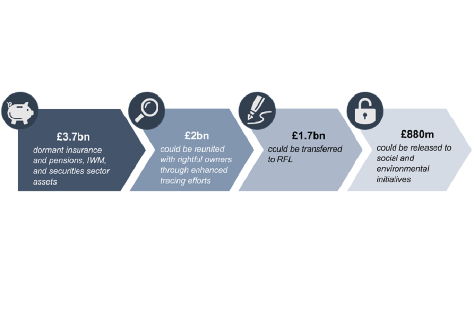 Infographic showing how money would be made available through the expanded Scheme. £3.7bn dormant insurance and pensions, IWM, and securities sector assets; £2bn could be reunited with rightful owners through enhanced tracing efforts; £1.7bn could be transferred to RFL; £880m could be released to social and environmental initiatives