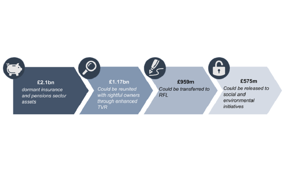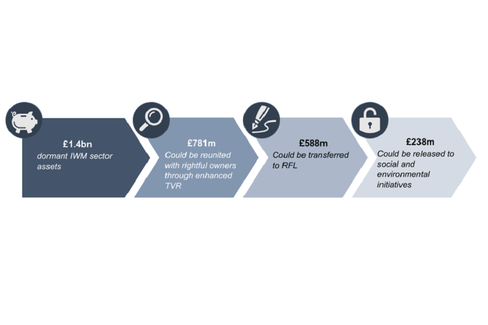 We are grateful to industry stakeholders who have worked to estimate the benefits of Scheme expansion in recent months. This has revealed that, from an estimated £3.7bn of dormant assets in the insurance and pensions, investment and wealth management (IWM), and securities sectors, circa £2bn could be reunited with their rightful owners through enhanced tracing, verification and reunification (TVR) efforts. This would leave circa £1.7bn available for transfer into the Scheme. Chapters 5–7 set out each sector’s contribution to these figures. In addition to those assets initially eligible for transfer into an expanded Scheme, it is expected that further assets will become eligible as they trigger the dormancy definitions over time.