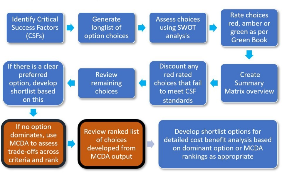 - Identify critical success factors (CSFs) 2. Generate longlist of option choices 3. Assess choices using SWOT analysis 4. Rate choices red, amber or green as per Green Book 5. Create Summary Matrix overview 6. Discount any red rated choices that fail to meet CSF standards 7. Discount any red rated choices that fail to meet CSF standards 8. If there is a clear preferred option, develop shortlist based on this 9. If no option dominates, use MCDA to assess trade-offs across criteria and rank 10. Review ranked list of choices developed from MCDA output 11. Develop shortlist options for detailed cost-benefit analysis based on dominant option or MCDA rankings as appropriate