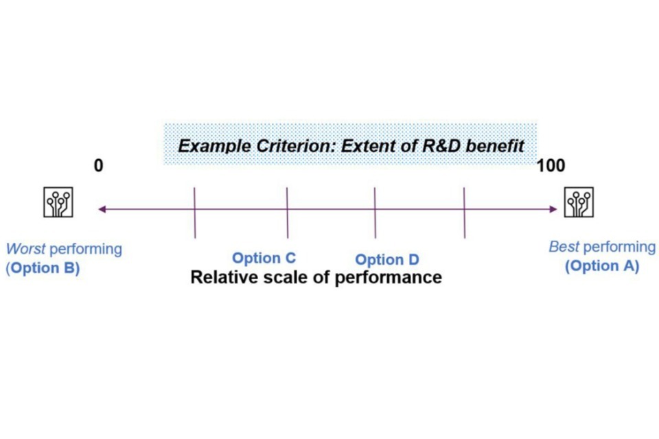 Say Option ‘A’ is judged the most effective, it is scored at 100. Then Option ‘B’ is considered the least effective and is scored at 0. The remaining Options ‘C’ and ‘D’ are scored in comparison with these reference points based on how well (or badly) they achieve the same goal. In general, the process is then repeated for all remaining options for that criterion.