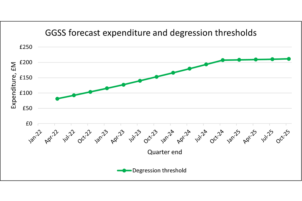| Quarter ending | Forecast expenditure (£M) as at 01/03/2022 | Expenditure Degression Threshold (£M), as at 01/03/2022 | Has the threshold been breached (YES/NO) |