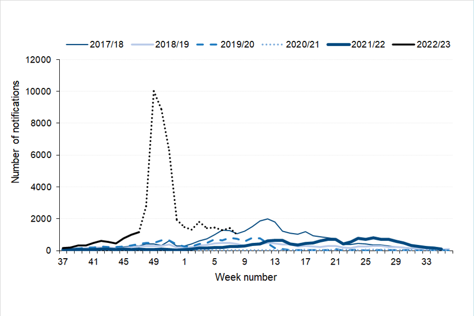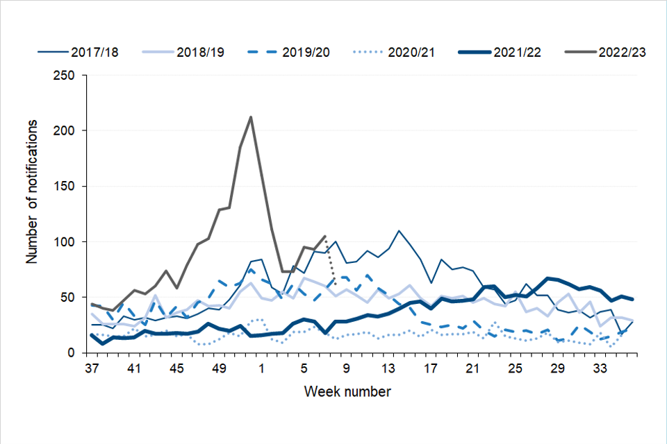 A season runs from week 37 in one year to week 36 in the following year (mid-September to mid-September). The 2022 to 2023 season data within this report covers 12 September 2022 to 26 February 2023.