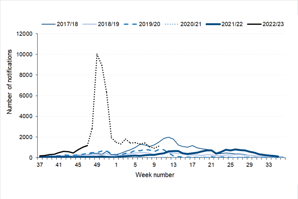 A season runs from week 37 in one year to week 36 in the following year (mid-September to mid-September). The 2022 to 2023 season data within this report covers 12 September 2022 to 12 March 2023.