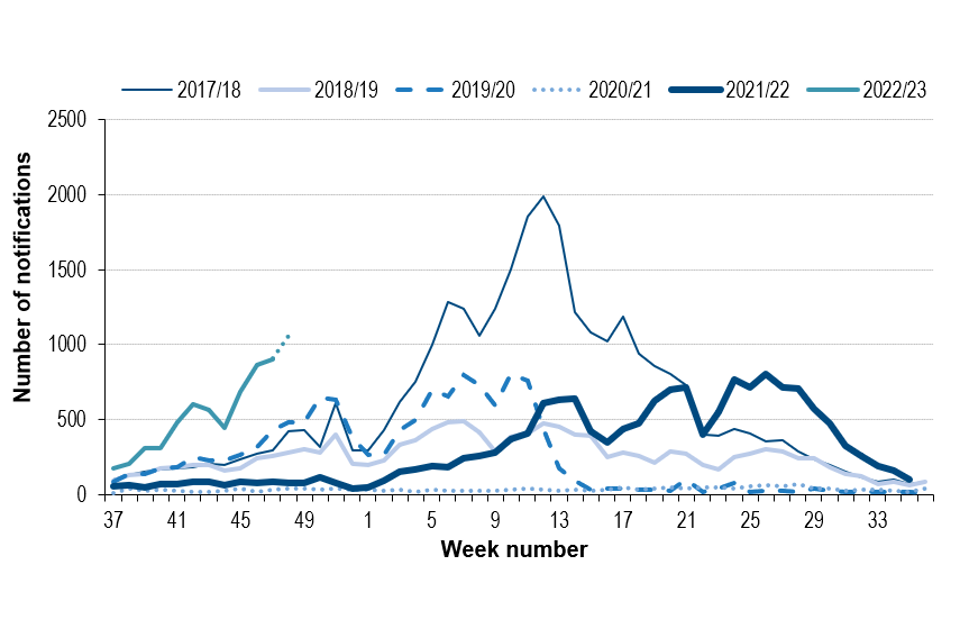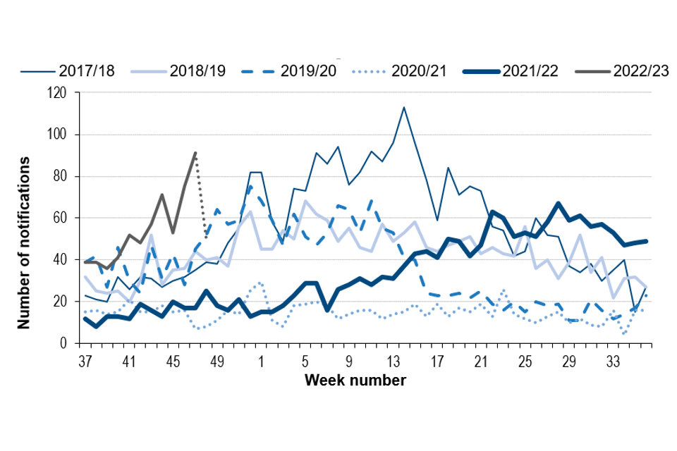Note: In this graph the 2022 to 2023 season goes up to week 48. Recent weeks in the current season may change due to delayed notifications being received, represented by a dotted line between week 47 and 48.