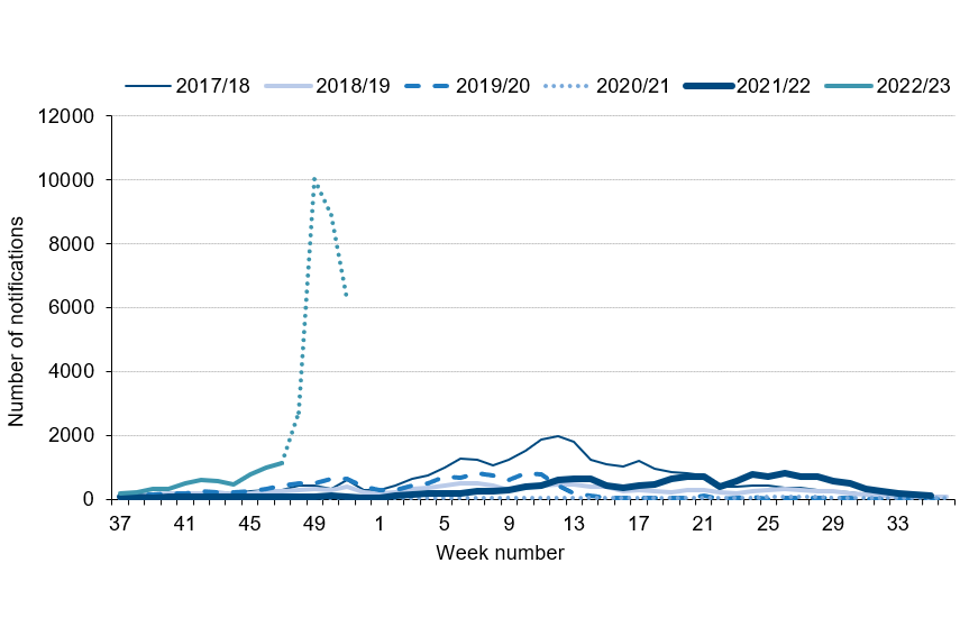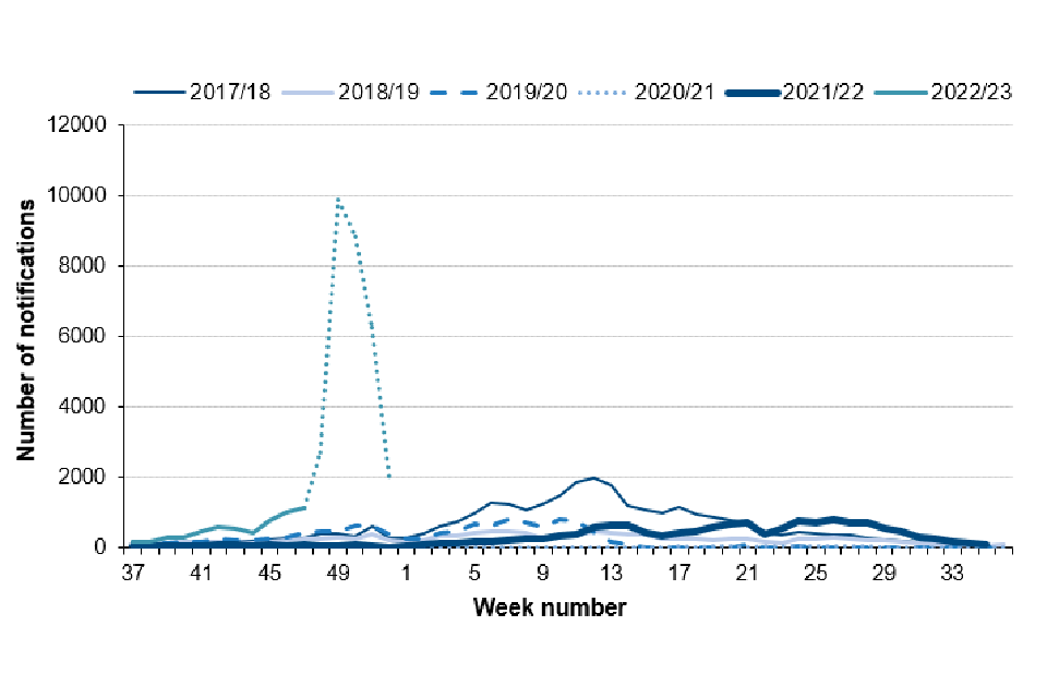 Note: In this graph the 2022 to 2023 season goes up to week 51 (25 December 2022). Recent weeks in the current season may change as further notifications are received, represented by a dotted line between weeks 47 and 51.