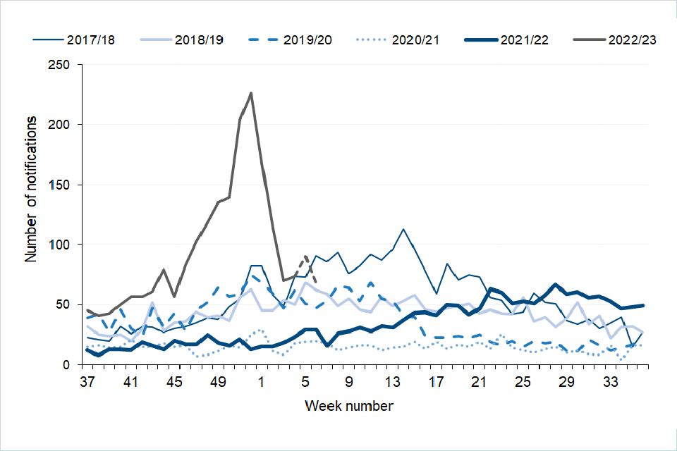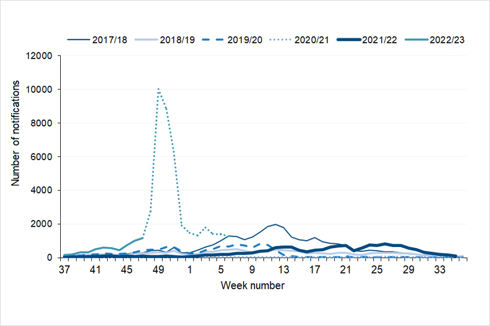 A season runs from week 37 in one year to week 36 in the following year (mid-September to mid-September). The 2022 to 2023 season data within this report covers 12 September 2022 to 12 February 2023.