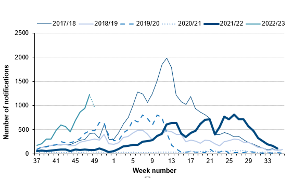 Note: In this graph the 2022 to 2023 season goes up to week 49 (11 December 2022). Recent weeks in the current season may change as further notifications are received, represented by a dotted line between week 48 and 49.