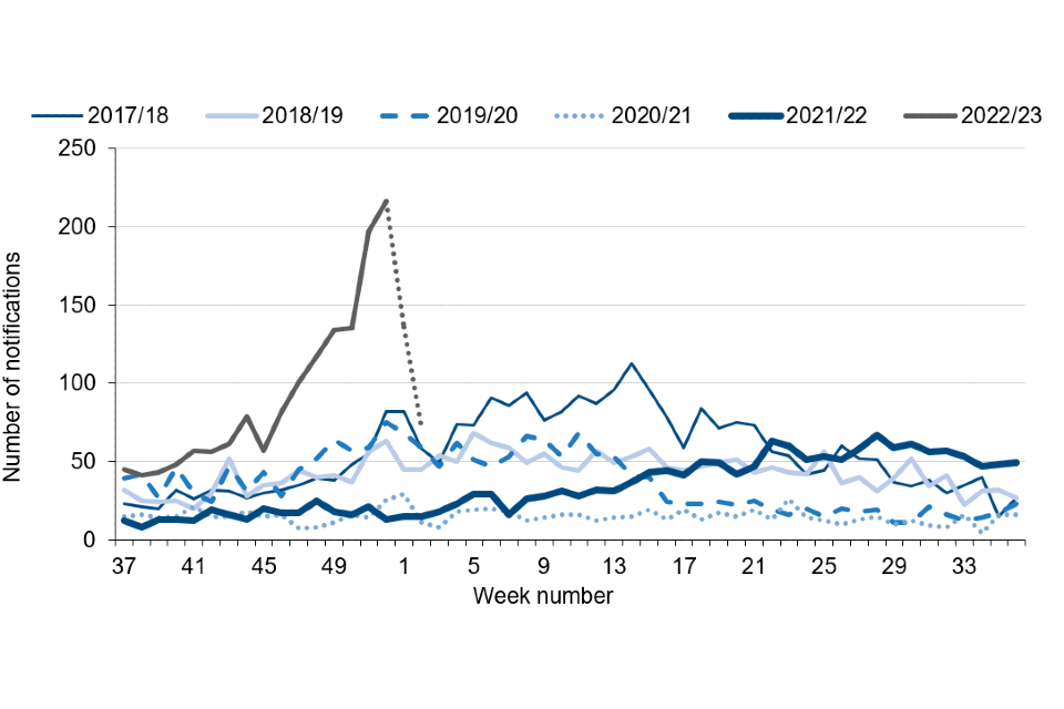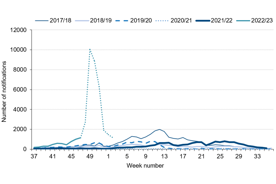 Note: In this graph the 2022 to 2023 season goes up to week 2 (15 January 2023); recent weeks in the current season may change as further notifications are received and processed, represented by a dotted line between weeks 47 and 2.