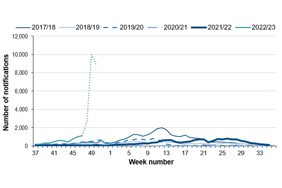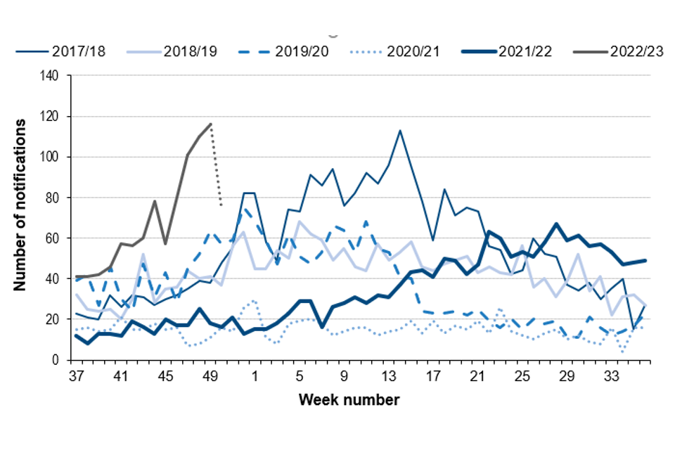 Note: In this graph the 2022 to 2023 season goes up to week 50 (18 December 2022). Recent weeks in the current season may change as further notifications are received, represented by a dotted line between week 47 and 50.