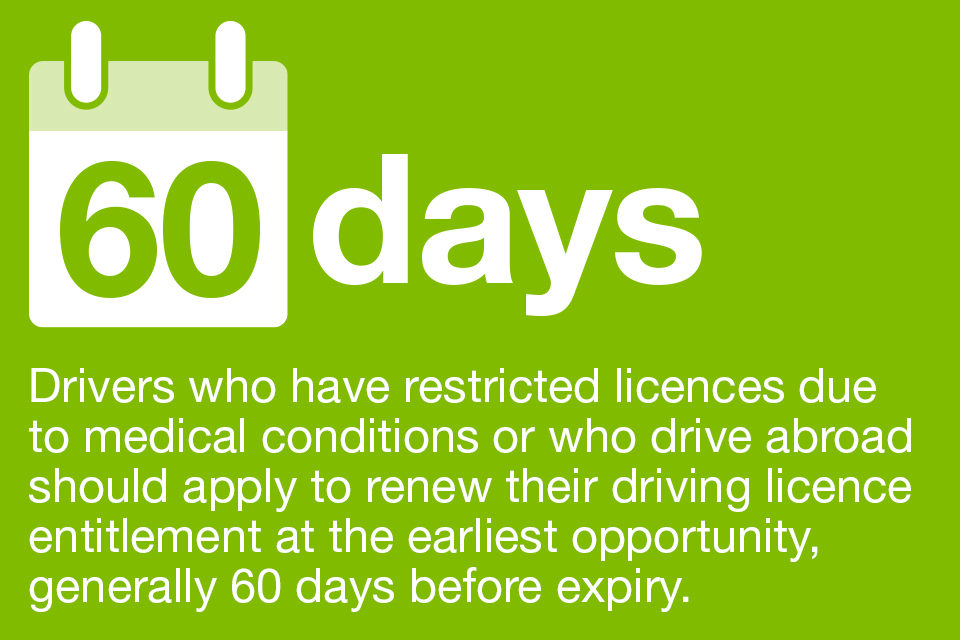 If you have a restricted licence due to medical conditions or you drive abroad, you should apply to renew your driving licence entitlement as soon as possible, generally 60 days before it expires. This will ensure that DVLA has enough time to investigate any medical conditions.