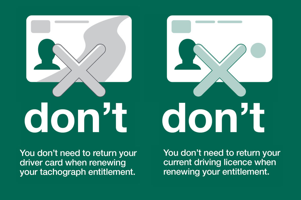 You do not need to return your driver card when renewing your tachograph entitlement. You do not need to return your current driving licence when renewing your entitlement.