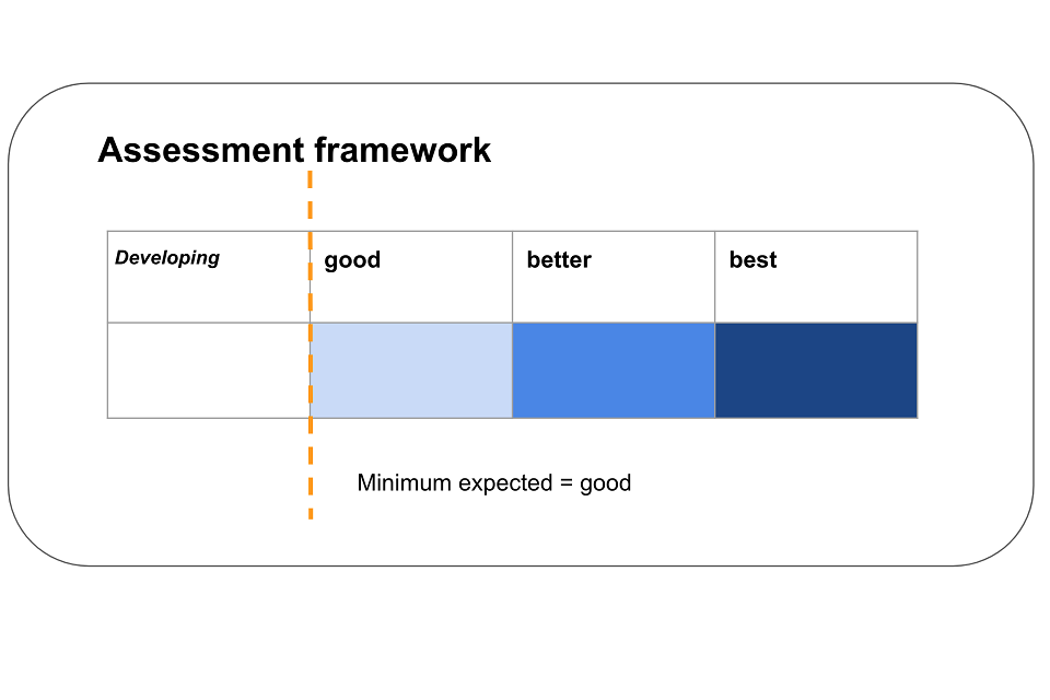 Continuous improvement assessment frameworks set out different levels of maturity against the most important aspects of a functional standard - from the minimum expected (good), to better and best, as shown in the diagram below. Some functions may align ‘good’ to existing levels of expected practice.