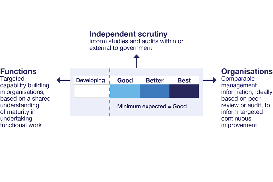 Functions may publish their continuous improvement assessment frameworks, setting out the themes, practice areas and criteria used for assessment, as a separate document aligned to the functional standard. For an example, see the Project delivery page.